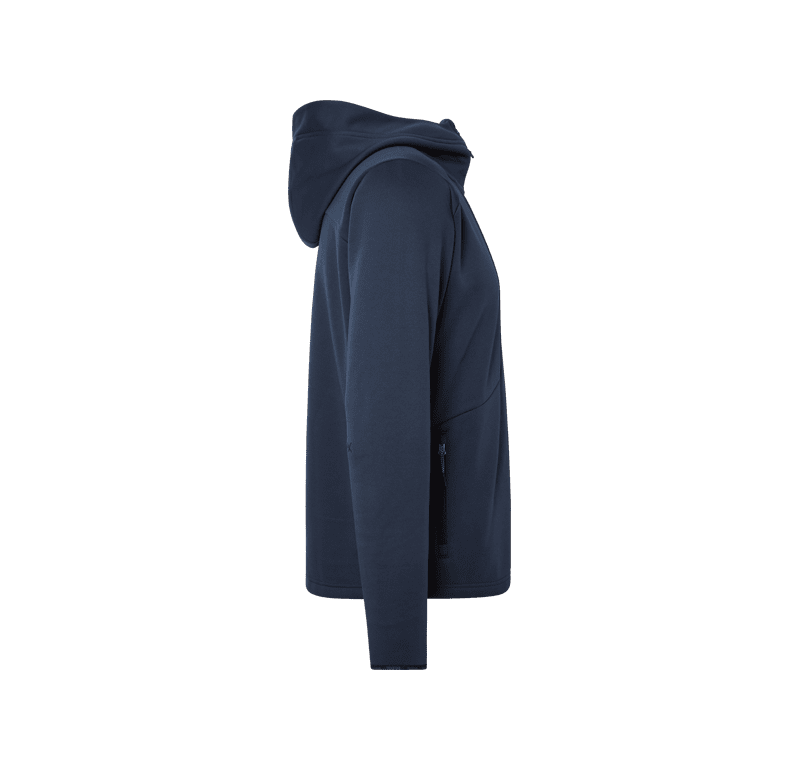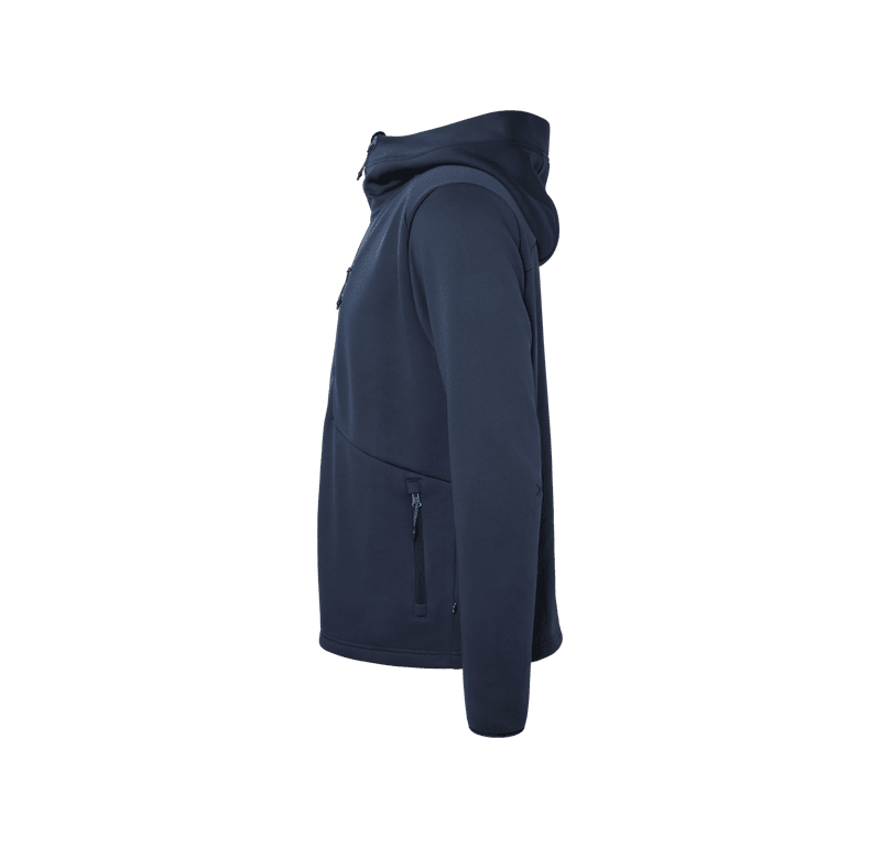 Hoodie i bondad polyesterfleece som håller formen och färgen länge. Blixtlåsförsedda fickor med reflexdetaljer och förböjda ärmar för bra komfort.